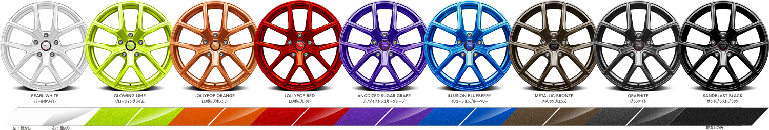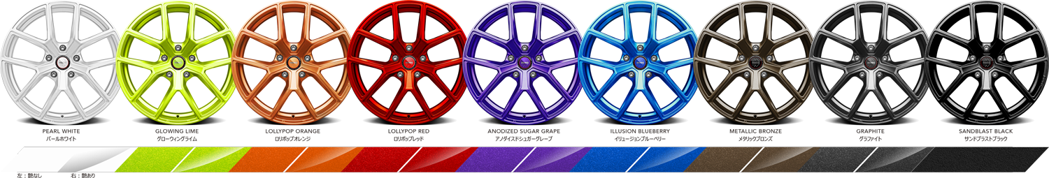 | 仕様 | 1ピース鋳造 (ロータリーフォームド) 全サイズ ランフラットタイヤ・TPMS対応 全サイズ JWL VIA 規格対応品 専用ハブ対応モデルあり |