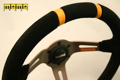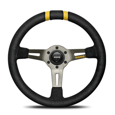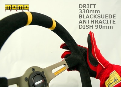 「ドリフト」は凹凸、コブのないプレーンなステアリンググリップを持ち、外径330mmクラスのスエード製グリップは素早く多くステアリングを回す必要があるドリフトに最適です。90mmディープコーンはmomoステアリングの中で最も深いDISH長を誇り、一般的なモデル(DISH長37mm)と比べてステアリングが約50mmほどドライバー側にオフセットされ、ボススペーサーを使用することなくドライビングポジションを調整することができます。グリップ部分は力の入れやすい31mm×30mmの真円に近い形状でレーシンググローブ装着時の操作感も抜群、両手で握る時だけでなくサイドターン時に片手でステアリングをホールドする場合もゆるやかなR面により手のひらで安定した操作が可能となっています。